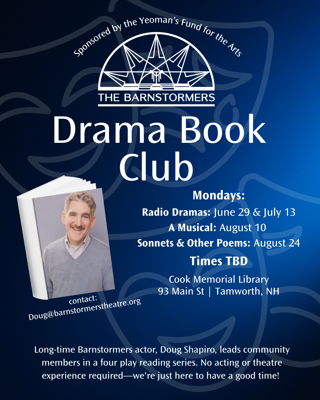 Whether you’re a drama buff or have never set foot in a theater, the Drama Book Club is a whole new way to experience a play with members of The Barnstormers Theatre! Join long-time Barnstormer actor, Doug Shapiro, as he leads you and members of the community, plus other surprise guests, in reading a play aloud together. Scripts will be provided in advance for those who might like to take a look prior to the club meeting, but preparation is not necessary! Sessions will feature radio dramas (June 28 & July 13), a musical (August 10), and “Hail Poetry!” (August 24). No acting or theater experience required—we're just here to have a good time!